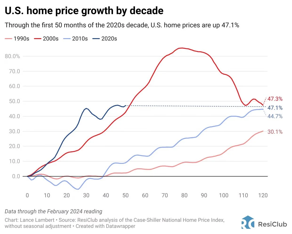 U.S. home price growth by decade: