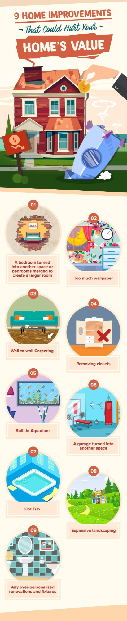 Combining two bedrooms to create a much bigger room, or turning a bedroom into another permanent living space, such as a home office or a huge master closet, is a common mistake that homeowners make. However, removing a bedroom is definitely the number one home improvement that could lower a home's value. The number of rooms in a home can actually make or break a sale because buyers always want the maximum number of rooms available in a home.